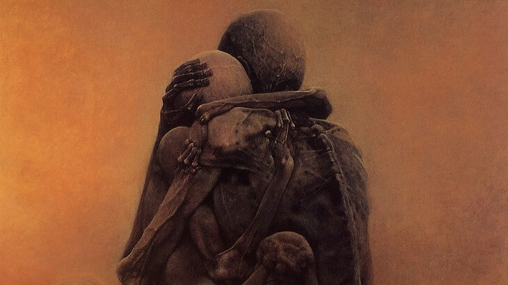 From the dreamscapes of Zdzisław Beksiński, draw thick sorrow and ruin. A world of crumbling monuments and hollow echoes—where the walls mourn and the ground grieves.
